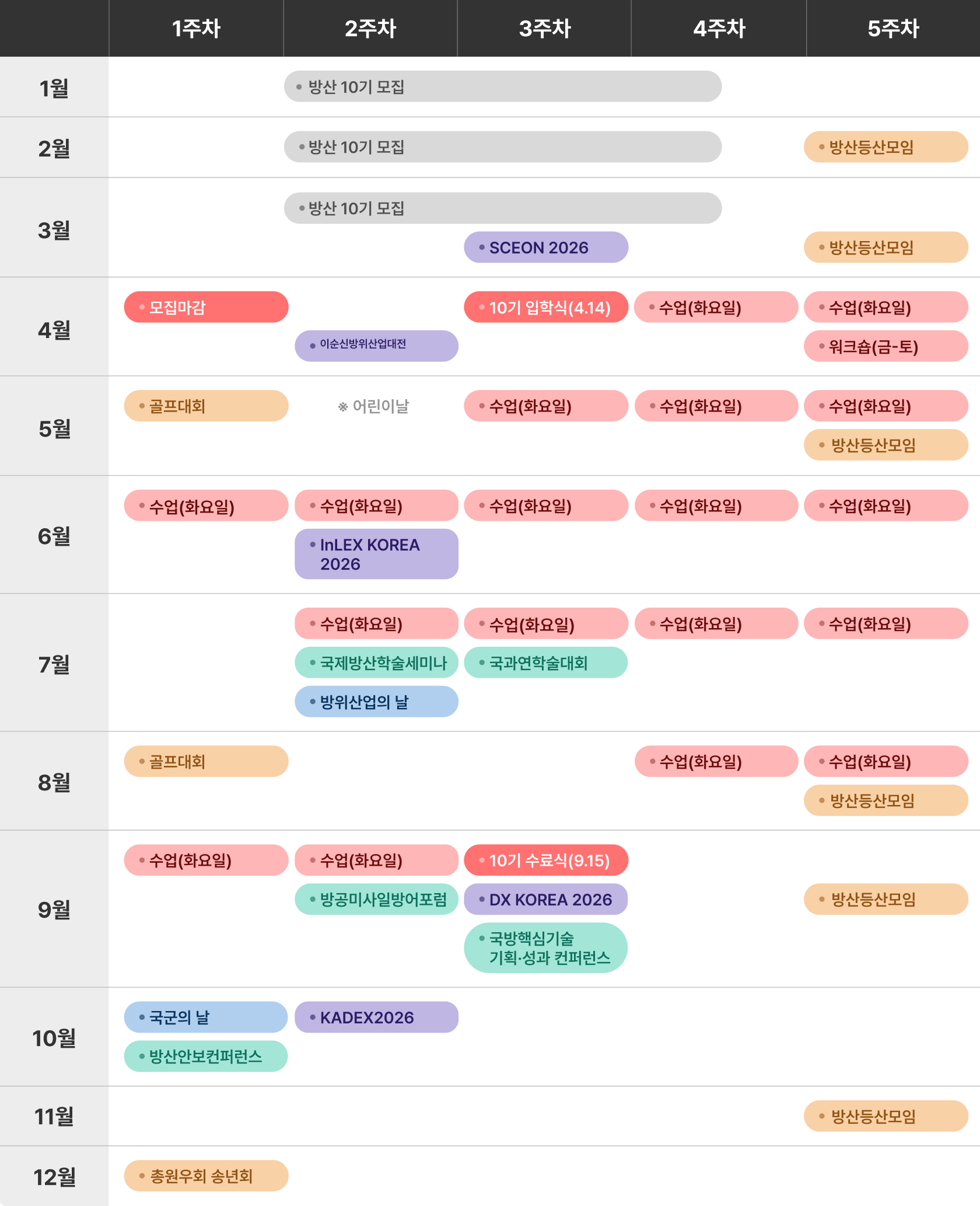 정부는 방위산업 경쟁력 강화, 방산수출기업과 중소벤처 기업에 대한 집중적 지원으로 방산 4대 강국 도약을 지향하고 있습니다. 이를 위해 방산수출 컨트롤타워 기능 강화하고 방산기업 혁신 역량 제고 위한 지원체계를 마련하고 있습니다.2026년 교육컨셉